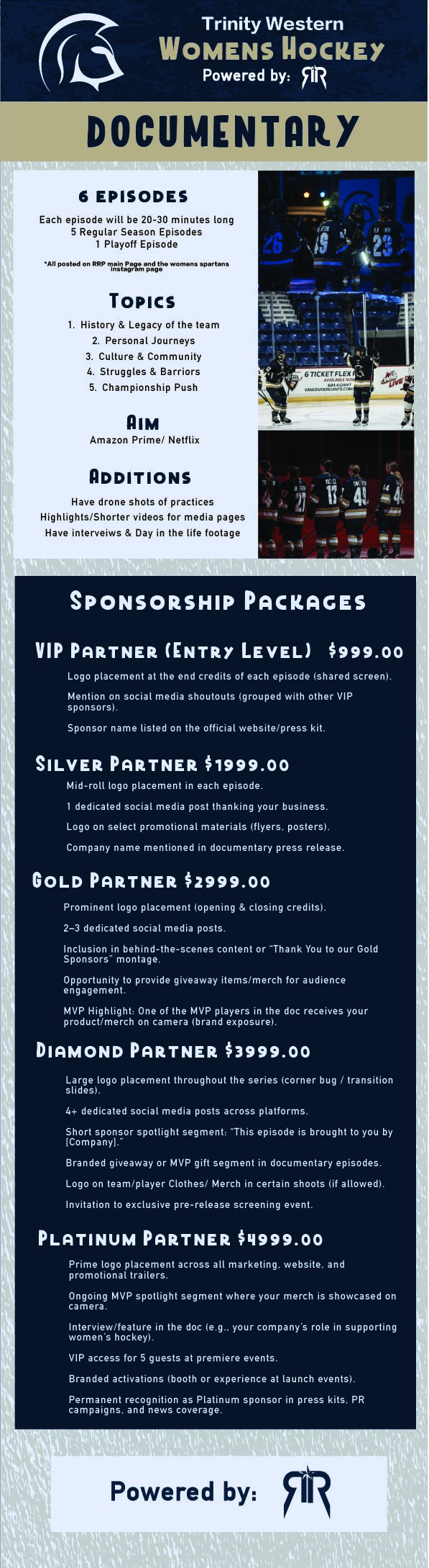 We are producing a documentary that takes viewers behind the scenes of the Trinity Western University Women’s USPORTS hockey team. Our goal is to highlight not just the excitement of the game, but also the real and often unseen challenges that student-athletes face every day. From balancing demanding academic schedules with intense training and competition, to navigating personal growth, teamwork, and the pursuit of excellence, this documentary will provide an honest look at the dedication, sacrifices, and resilience required to succeed both on and off the ice.